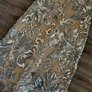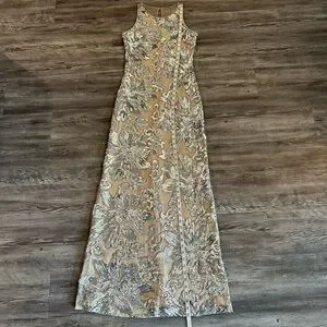 Chic maxi dress with silver floral patterns. Cream base enhances elegance. Perfect for formal events.