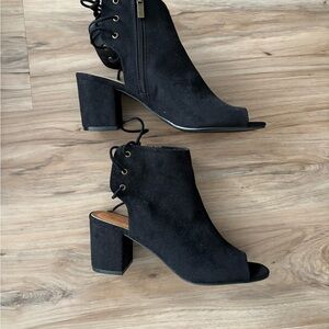 Step out in style with these chic black peep-toe ankle boots. Featuring a comfortable block heel and a sleek design, these boots are perfect for any occasion. Never worn. Not with original box. Reasonable offers accepted.