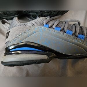 Comfortable Puma sneakers for kids. Features gray and blue design. Ideal for active play.