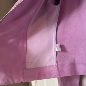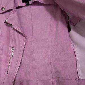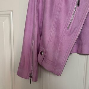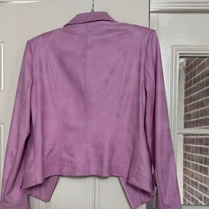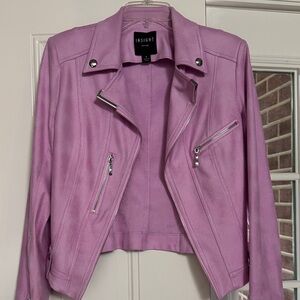 Stylish lavender/fuchsia faux suede jacket by Insight. Features sleek design with silver accents. Perfect for a bold fashion statement. Size 8. Please note this jacket has a non-functional zipper in front. You can partially close the jacket with an eye hook shown in the photos. It does not close fully with this hook as it was meant to be worn open and sold as such. Worn only 3 times so it looks fantastic. No rips or tears. Non-smoking environment.