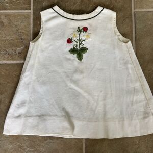 The product is a vintage 1960s Ruth Of Carolina dress for girls aged 12 months, featuring a charming mod/GoGo look with strawberry accents. This casual set captures the retro style of the era, perfect for a little girl who loves classic fashion with a modern twist. The dress and matching set are designed to provide a whimsical and nostalgic experience for young children, adding a touch of vintage flair to their wardrobe.
