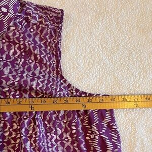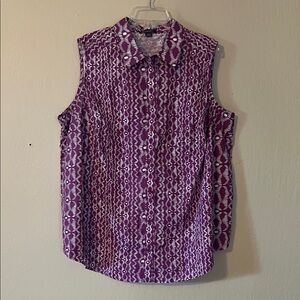 Roaman’s purple patterned button-up,sleeveless blouse-size 22W paired with a matching cardigan-size 3X(30/32)..measurements in photos .