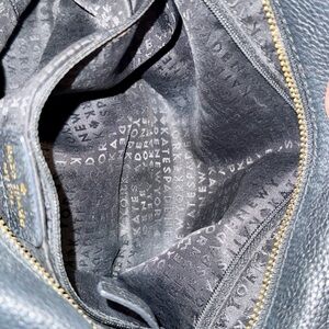 Chic black pebbled leather satchel. Gold-tone hardware. Dual handles and zip closure.