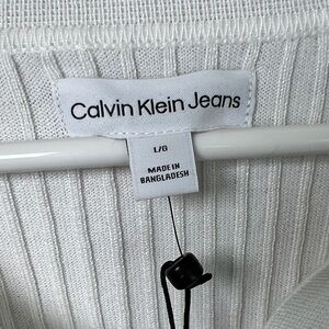 Chic ivory ribbed blouse by Calvin Klein. Features a stylish collar and long sleeves. Ideal for versatile styling.
