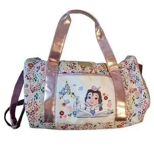 Disney Belle Beauty and the Beast with Belle reading a book overnight bag. Metallic pink, white, bright multicolor print. Perfect gift for a little girl or any Disney obsessed adult. Comes with a crossbody strap and handbag straps.