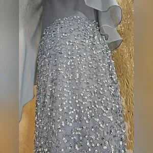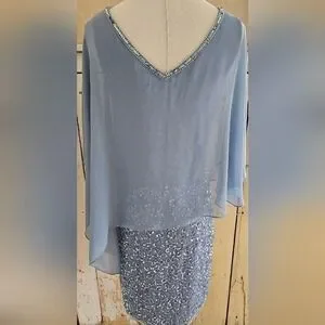 JKARA Blue Sequence Asymmetrical Cape/Shawl Flutter Sleeves Sheath Dress-Size 6P