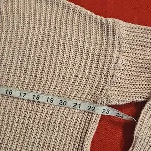 •The color on this is a blush, almost like a pale pink, rose beige...Brandy Melville, so it's oversized, crop top....'one size fits most", but I'd say comfortably up to a size 12 after that, it's gonna look fitted.
