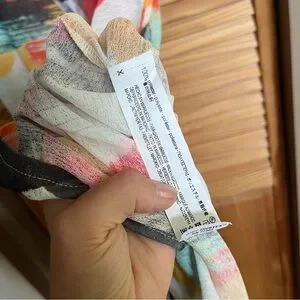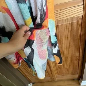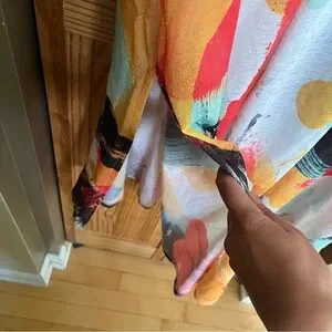 Stand out with this vibrant Zara midi dress. Features bold splashes of red, yellow, and black. Perfect for making a statement. It’s a sheer type material.