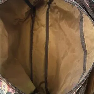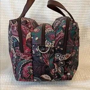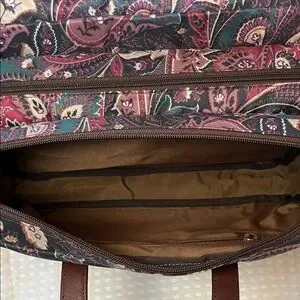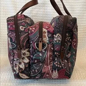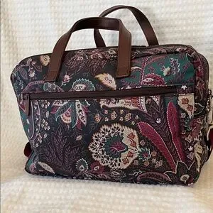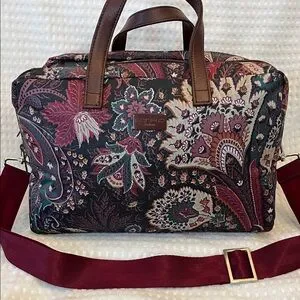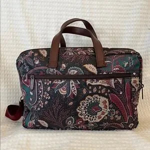 Stylish ETRO Profumi Floral Paisley Messanger Bag with Burgundy Strap featuring a floral paisley design. Comes with a burgundy strap and brown handles.