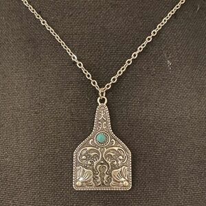 Silver Cow Tag Necklace with Faux Turquoise Stone