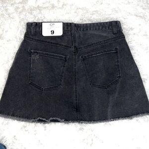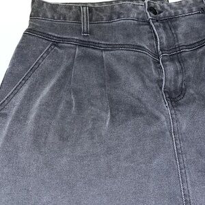 Lightly distressed charcoal denim skirt. Frayed hem edges, front pleats, 4 pockets, high waist.