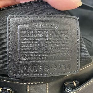 This Coach is all black inside and out with beige contrast stitching. She is in very good condition. Comes with original hangtag and I added pink cherries. She has silver tone hardware with normal wear. Inside she has two sections the main section has a zip pocket and the other section has none. Outside under flap she has two pockets. Her shoulder strap is adjustable. Please see all pictures for condition and approximate measurements. 2006, #9434.