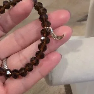 This elegant bracelet features rich brown beads paired with a sparkling silver crescent charm. Perfect for adding a touch of sophistication to any outfit.