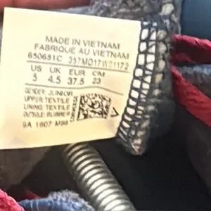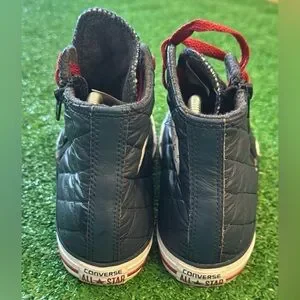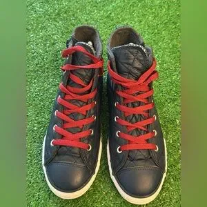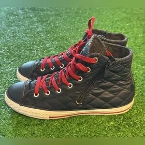 Stylish quilted high-top sneakers featuring vibrant red laces. Perfect for casual wear.