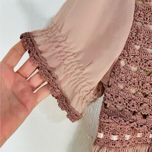 Axes Femme-Japanese dusty rose ultra feminine Fairycore babydoll mini dress with crochet bodice and ribbon at waist.Puffed sheer sleeves.Fully lined with lace trimmed slip.Beautiful embroidery on skirt.Size M but runs smaller.Measurements in pics.Is approximately 31” in length.Embroidery . Crochet . Lace . Babydoll . Whimsygoth . Feminine . Romantic . Boho . Bohemian . Garden Girl . Goth . Fairycore . Balletcore . Sabrina Carpenter . Spring . Festival . Valentine’s Day