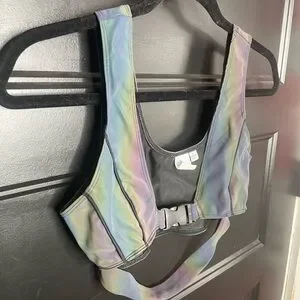 Shimmering iridescent rainbow bra top with a sleek design. Buckle detail.