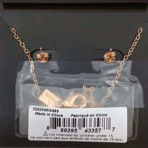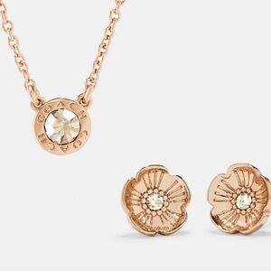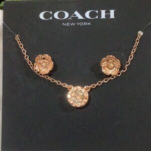 Coach earring and necklace set. Flower studs with rose gold colored rhinestone center, “Coach” branded necklace with rose gold colored rhinestone.