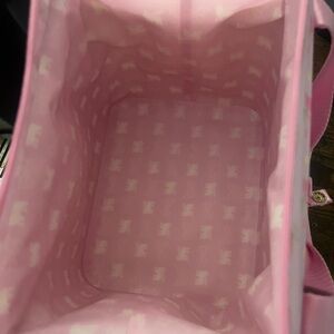 Charming pink bag with floral accents. Features a sturdy strap and playful keychain. Ideal for stylish moms.