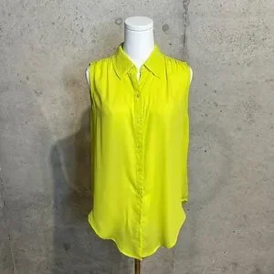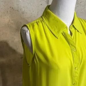 If you’re looking to add a pop of serious color and flare to your wardrobe, this Express top is it! It’s a vibrant lime green with a collared neckline and button front closure. Made of lightweight polyester with a flowy drape, perfect for layering under blazers for work or styling with jeans and skirts for a bold pop of color.