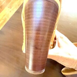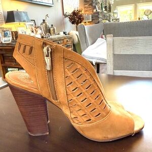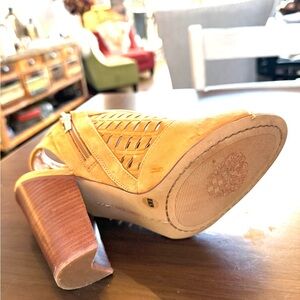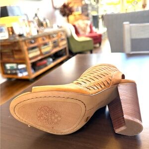Step out in style with these Vince Camuto chic tan suede heeled sandals. Perfect for any occasion, these shoes offer both comfort and elegance. Worn twice. Approximate heel is 4”