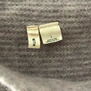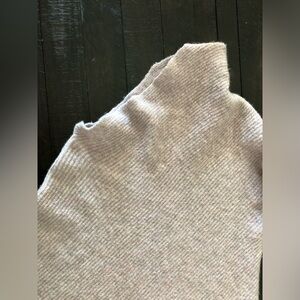 Made by Moth, an Anthropologie label. The soft lavender/lilac cowl neck line on this partially-wool knit ribbed sweater is open to the wearer’s left side, to show off shoulder, and caps the right shoulder, with added ruching on each side to help accentuate the sleek asymmetrical look. The sleeves are dolman style with tighter ribbing on forearm to wrist. This was tough to capture without it looking wonky but looks great on a body, see Anthropologie image on model. Pictures don’t give the lavender justice, the close up of shoulder is the only one that looks the best.
