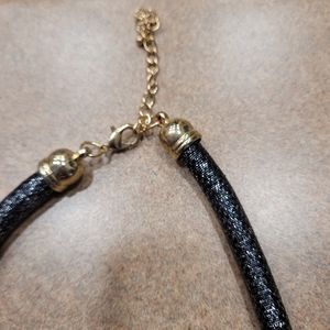 Black rope necklace with gold medal, black, and gray circle.