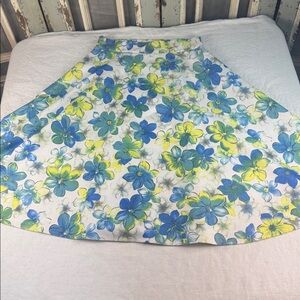 Embrace elegance with this vintage floral print skirt, featuring vibrant cream, blue and yellow hues. Hand tailored in the Philippines. Nice A line pull on swing skirt with stretch fabric. Super comfortable! Can also be worn as a strapless top or cape. Super versatile and a true standout piece. Perfect for any occasion. Callouts: perfect on outside. Some small stains on the underside definitely not visible when wearing.
