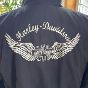 Classic black quilted lined jacket with zip front. Embroidered Harley-Davidson logo. Functional and versatile. Lots of details. Great used condition. Could fit a 1X it runs big. Pit to Pit 22"