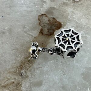 Elegant silver charm featuring a detailed spider web and dangling spider. Perfect for adding a unique touch to your jewelry collection.