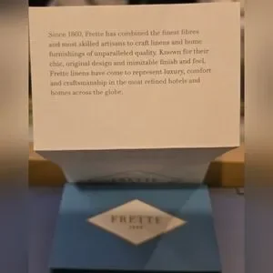 Frette (/ftefreh-TAY)is an Italian textile company that manufactures linen. Established in Grenoble, France, in 1860, it was relocated to Concorezzo, Italy, five years later. Their headquarters are currently in Monza, Italy. As of 2023, the company owns and operates over 100 boutiques worldwide. Copyright from Wikpedia Online