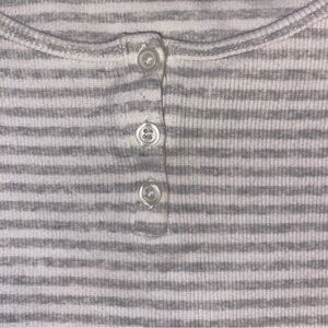 Beautifully made cozy shirt with 3 button detail, heather gray and white stripes