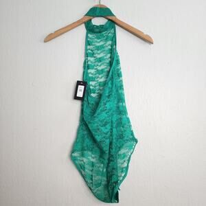 Frederick's Of Hollywood Margarita Green Floral Sheer Lace Teddy Halter One-Piece Stretch Bodysuit