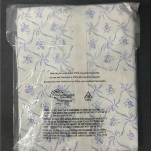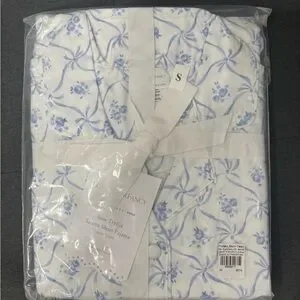 Elegant pajama set by LoveShackFancy. Features a delicate blue floral pattern on white fabric. Perfect for a cozy night in.
