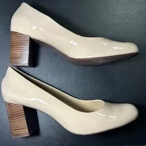 Chic beige heels with a glossy finish. Features a robust wooden block heel. Ideal for versatile styling.