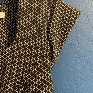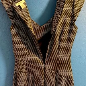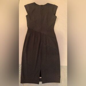 Chic midi dress with a geometric black & white pattern. Features a flattering slimming silhouette. Cap sleeves. Perfect to wear all year. Ideal for both work and evening wear. Back zippered. Back kick pleat. Fully lined. Preowned- in excellent condition with only light wear under arm pits as shown in last picture.