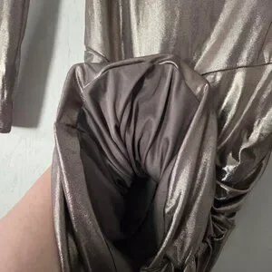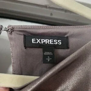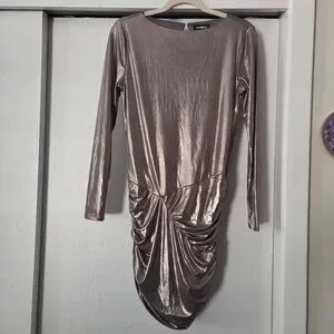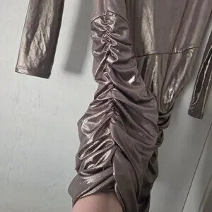 Express size small gold metallic mini dress. Long sleeves, crew neck, keyhole back with hook and eye closure at the top. Material is ruched on the sides and the body of the dress is fully lined. Great condition with no obvious signs of wear. Body: 93% polyester, 7% spandex. Lining: 100% polyester. Measures approx. 16.5” armpit to armpit, 35” length (at the longest part as it hangs), and 24” sleeve.