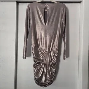 Express S Gold Metallic Ruched Mini Dress Long Sleeves Keyhole Back Stretch