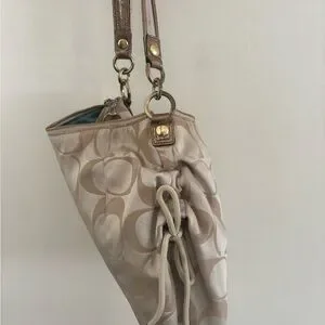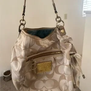 Coach Poppy drawstring Signature Beige and Tan Shoulder Bag