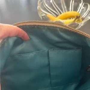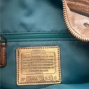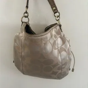 Stylish Vintage Coach shoulder bag with signature pattern. Features beige and tan tones. Perfect for everyday use.