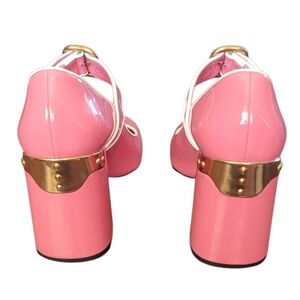 Pink & white Prada Mary Jane block heels with gold accents. Patent leather. 3.5" heels. Size 39. There are a couple of small scuff marks and indents on the heel. The soles show some light wear. Overall, they're in good preowned condition.