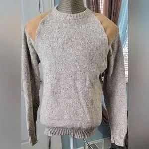 Vintg Early 80s Sweater Mens L Oatmeal Tan w/ Leather Patches Wool Blend US Made