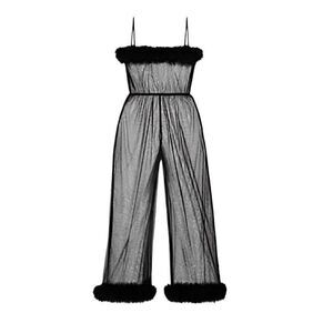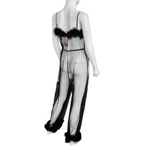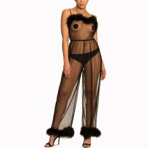 incredible sexy mesh jumpsuit with feather accents at the collar and legs. adjustable straps. retailed for $100 & sold out