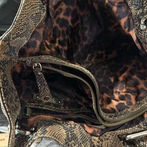 Snake Pattern in tan and black Leather with silver hardware. It has a magnetic closure with 3 inside compartments. Excellent condition.