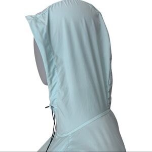 Size Small. Like new condition - no signs of wear. Washed and ready to wear! Color is “Aqua Sky” but I think it’s more of a minty green color. Very lightweight. 100% Polyester. Full zip front with attached hood. 2 zip pockets on front. Reflective details on arms and back. Shown modeled on a size 0 mannequin so fit may differ. Approximate measurements (taken when laying flat - cannot guarantee fit):