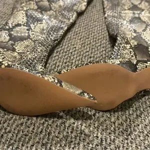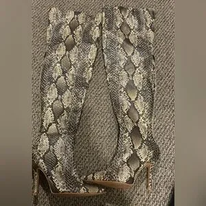 Chic boots with a bold snakeskin design. Features a sleek zipper detail. Worn once. Thigh high snake skin boot. Zipper is a little difficult to zip (will most likely become easier over time)