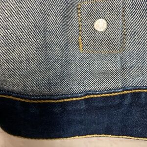 Here is a fantastic jean jacket full of the original style. It’s a size L. The chest is 44 inches and the length is 26. This is timeless and classic. Enjoy!