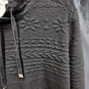 Stylish black sweater with textured design. Features a crew neck and drawstring detail. Perfect for casual wear.