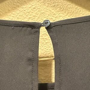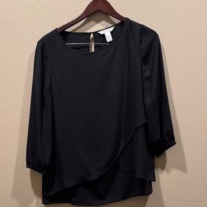 Stylish black blouse with layered design. Features three-quarter sleeves. Ideal for any occasion.