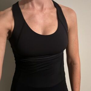 Sleek black racerback Lululemon athletic tank top. Perfect for workouts. Love this fit so much. Comes with a built in bra with the option to put in inserts or take them out. Great quality material with a gentle compression feel to it. Get this classic tank top today! As always, item comes washed and from a smoke free home!