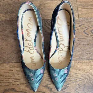 Keywords: Sam Edelman pumps, floral jacquard heels, women’s size 6 dress shoes, blue statement heels, wedding guest shoes, party pumps, elegant floral shoes, cocktail heels.